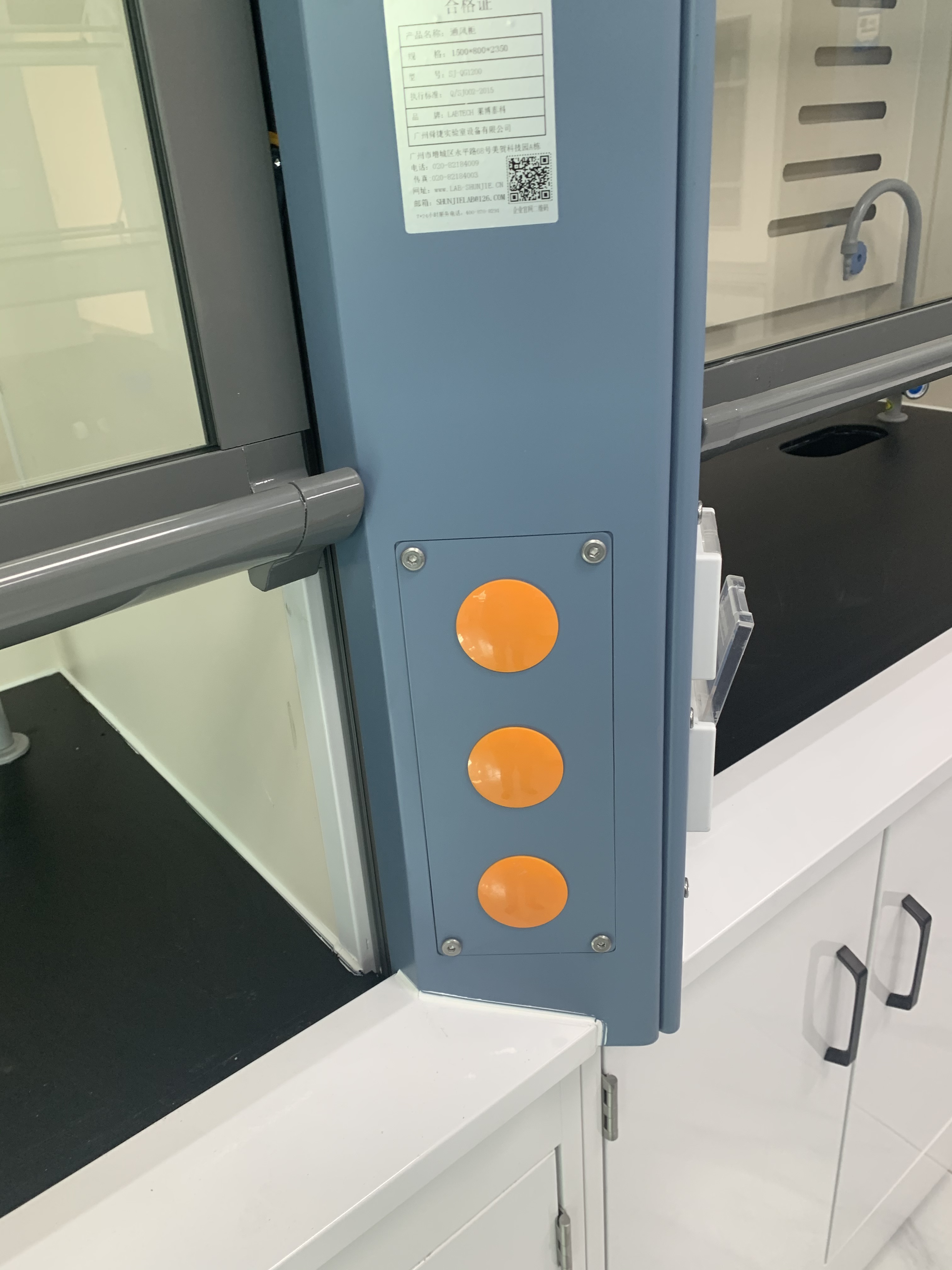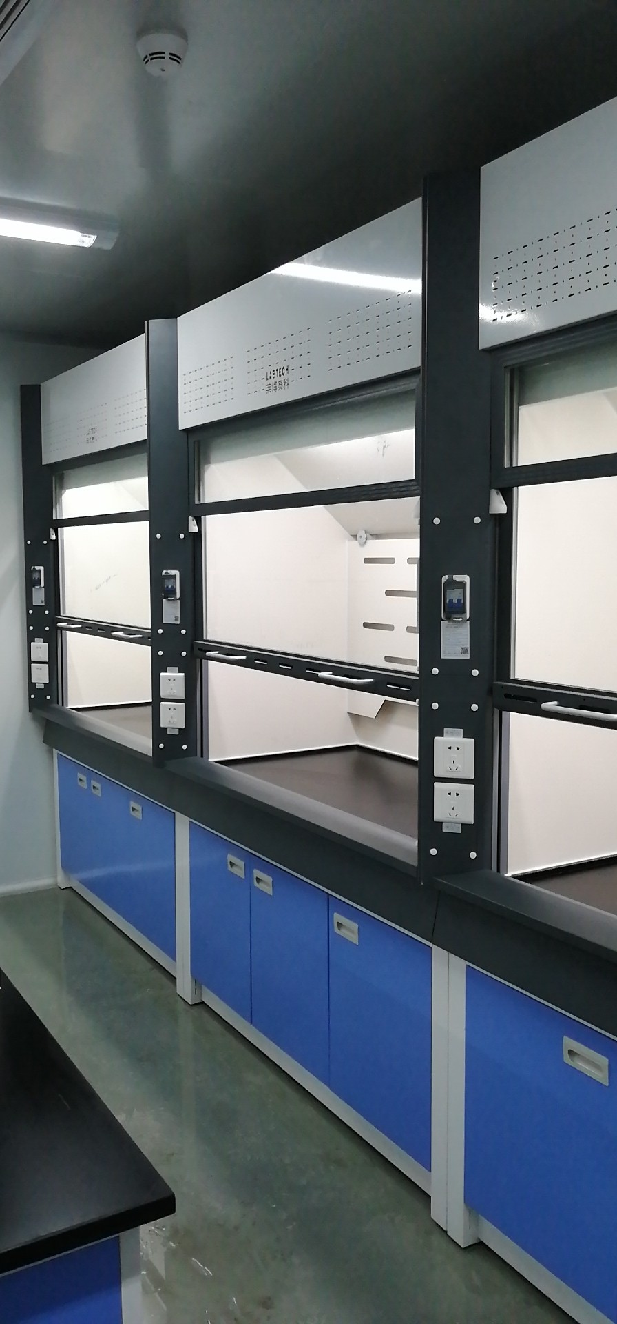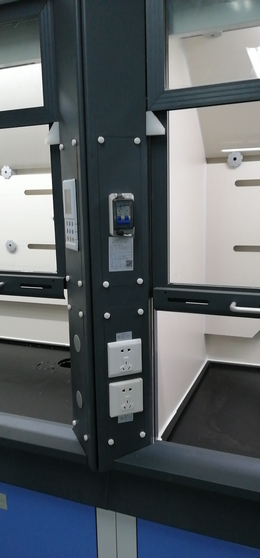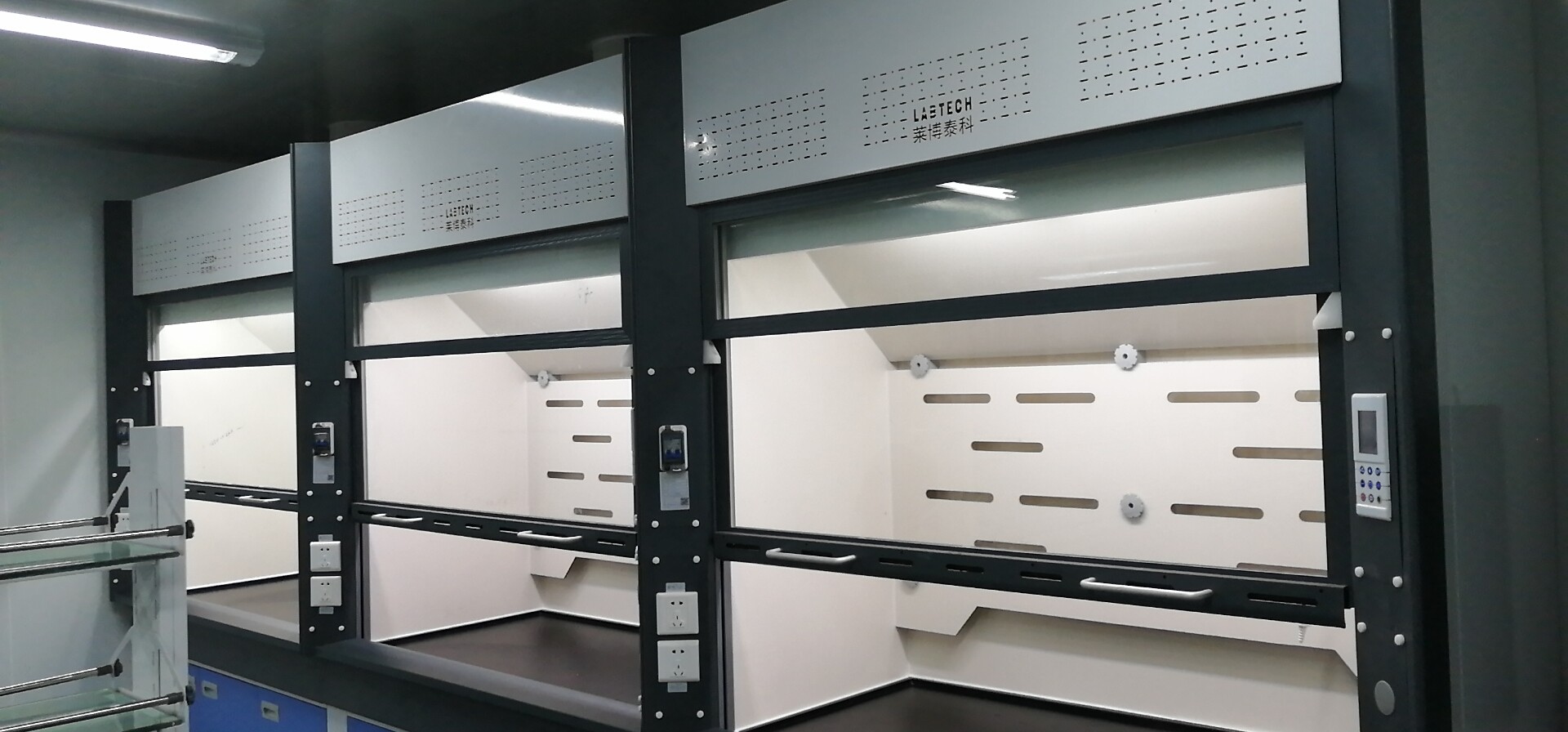 (6)照明:采用實(shí)驗(yàn)室專(zhuān)用節(jié)能燈具,隱藏于頂板上,不與通風(fēng)柜內(nèi)實(shí)驗(yàn)氣體直接接觸,易更換,亮度完全滿足實(shí)驗(yàn)要求。